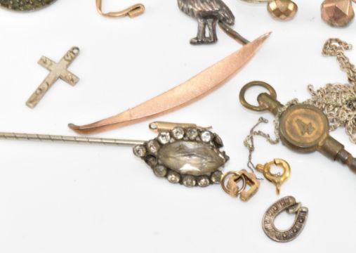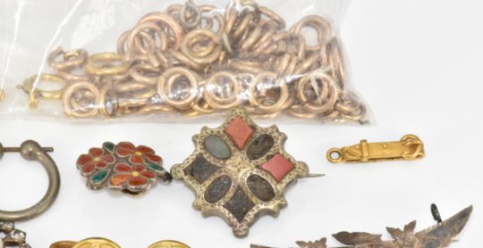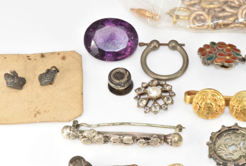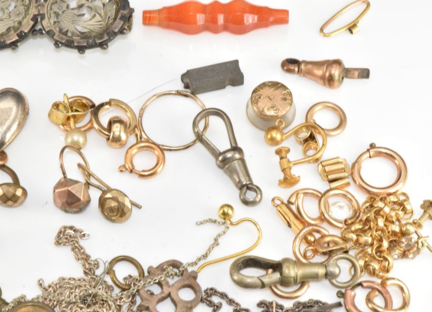 A collection of damaged jewellery parts including gold plated loops/ links, gold plated barrel and bolt clasps, 15ct gold stick pin top set with a spinel (0.8g), 9ct gold damaged bolt clasp (0.5g), silver crown earrings, silver chain, 9ct gold single earring and another section of 9ct gold earring (0.7g)