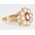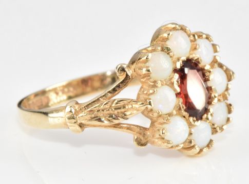 A 9ct gold ring set with an oval cut garnet surrounded by opals, 2.5g, size N