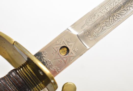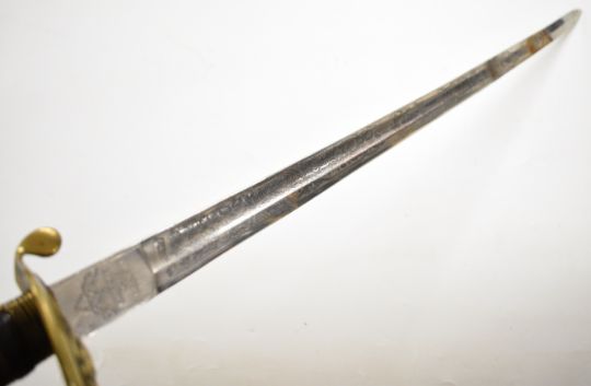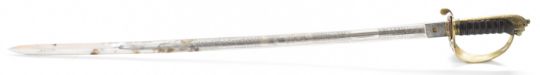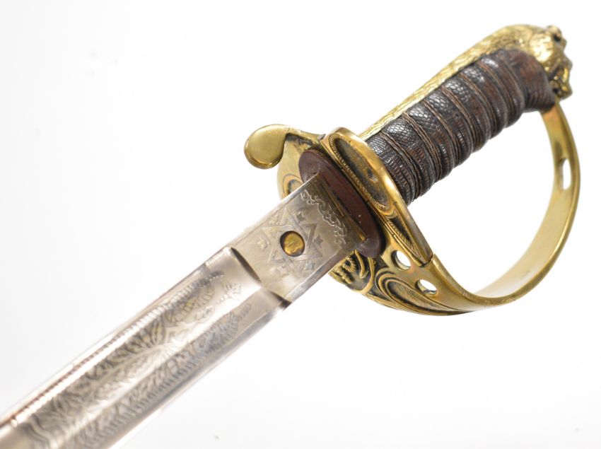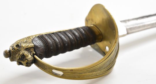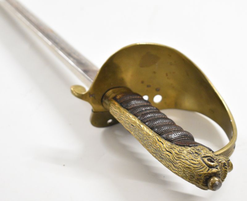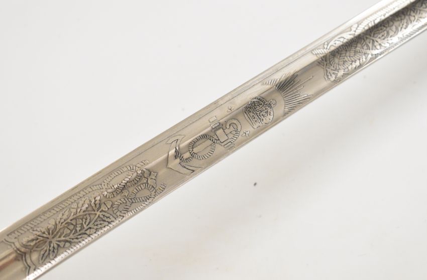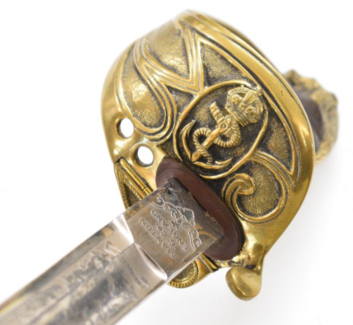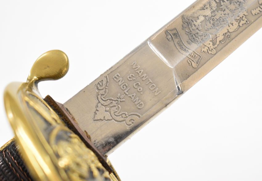 British Royal Navy Officer's dress sword, the etched 79cm blade decorated with Royal Cypher and anchor, with maker's name Manton & Co England to the ricasso, gilt brass handle, folding guard, wire bound fishskin grip, fouled anchor motif to guard and lion head pommel, in a leather and brass mounted scabbard, overall length 94cm. PLEASE NOTE: WE ARE NOT ABLE TO OFFER OUR USUAL POSTAGE SERVICE FOR THIS LOT