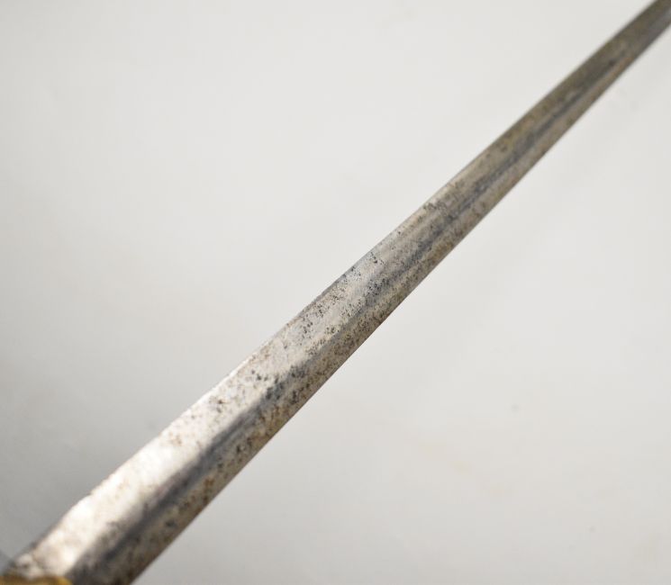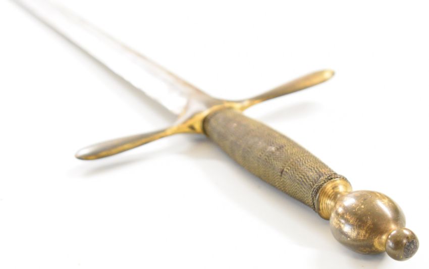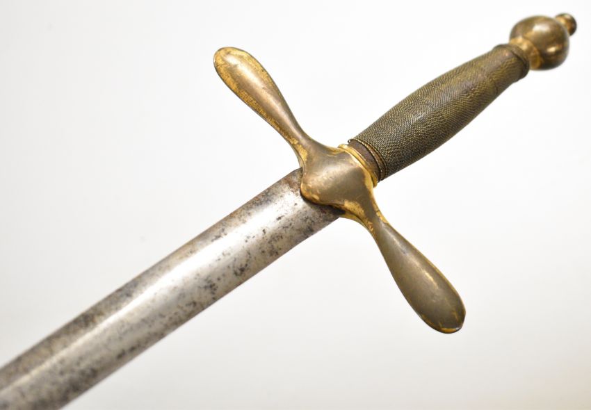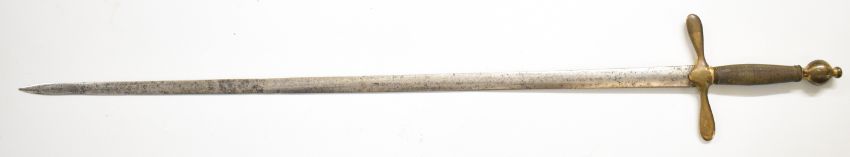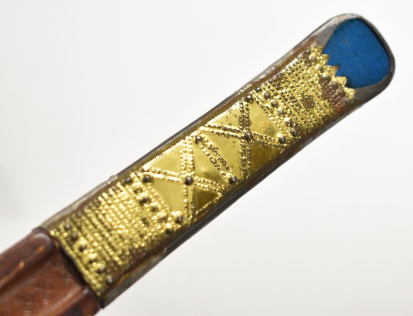 Eastern or similar ceremonial sword with 74cm blade, brass crossguard, wire wrapped handle and spherical pommel, in leather/cork and metal mounted scabbard, overall length 91cm. PLEASE NOTE: WE ARE NOT ABLE TO OFFER OUR USUAL POSTAGE SERVICE FOR THIS LOT