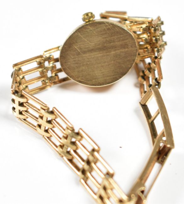 Royale 9ct gold ladies wristwatch with gold hands, baton hour markers and dial and quartz movement, on 9ct gold bracelet, case diameter 15mm, 9.9g.