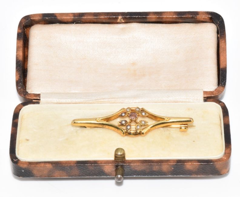 A 9ct gold bar brooch set with paste and pearls, 2g, 4.5cm, in vintage box