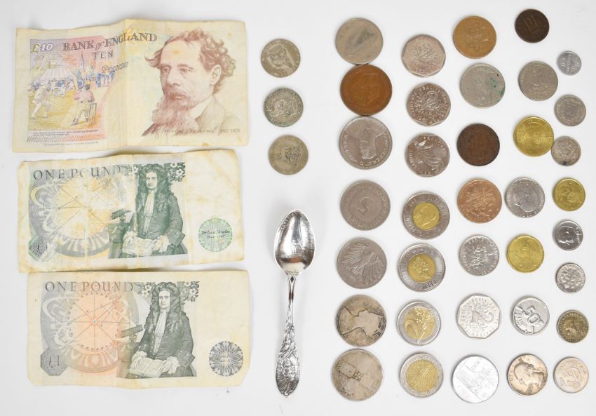 Two Queen Victoria Gothic florins (21g), 19g of further pre 1947 British silver coinage, Bank Of England Kentfield £10 note, two £1 notes and a quantity of world coinage to include American, Swiss, Canada, Germany and Euro