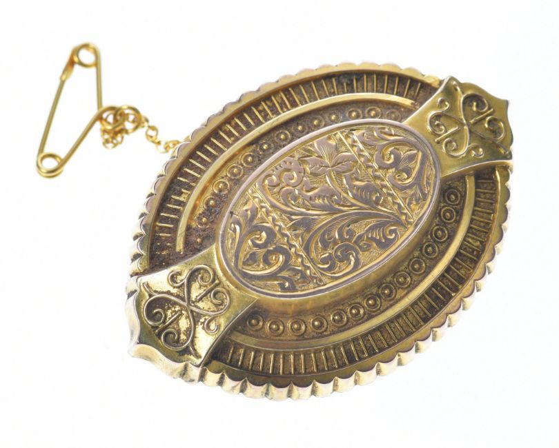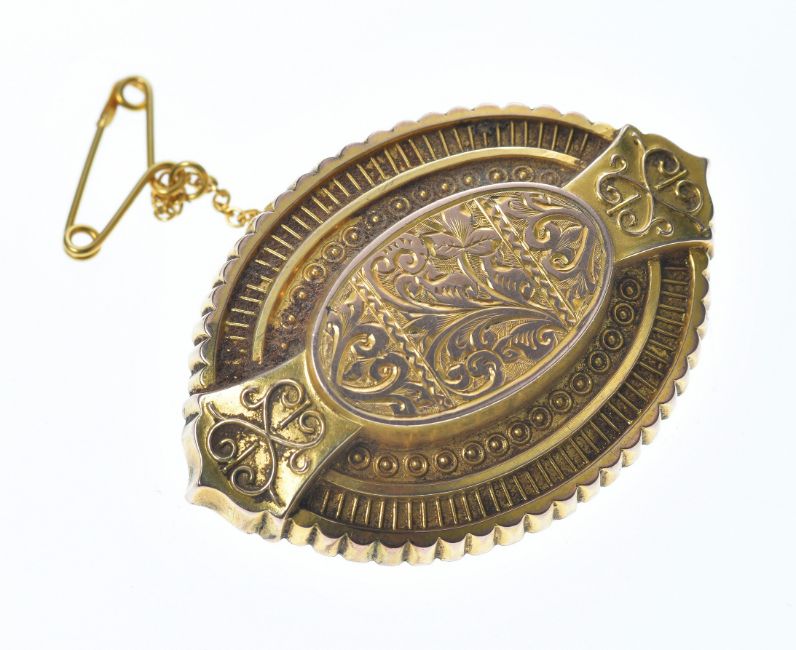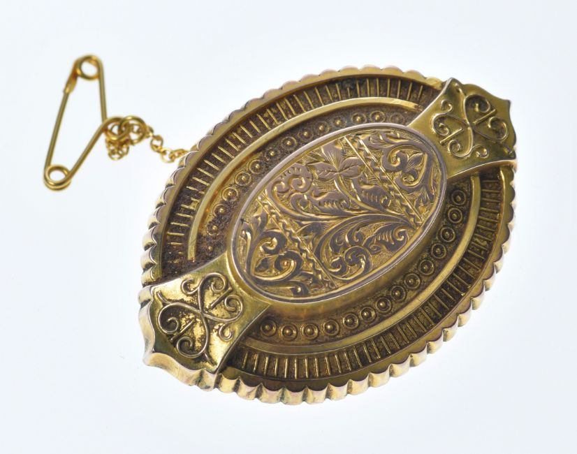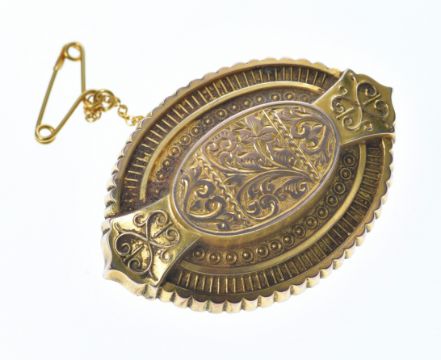Victorian 9ct gold brooch with engraved and embossed decoration, 6.5g, 4cm
