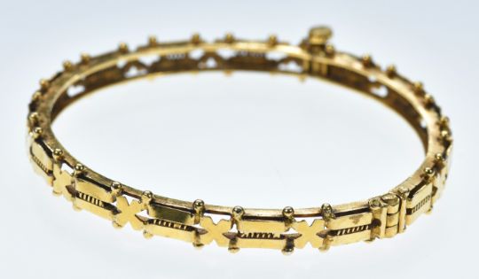 A yellow metal bangle with bar and cross decoration, tests as 21k gold, 20.4g