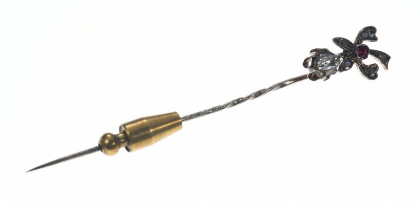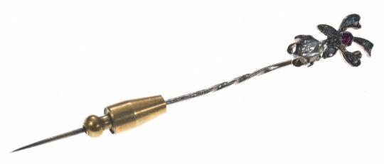 Georgian stick pin set with rose cut diamonds and pink paste, 1.6g, 7cm