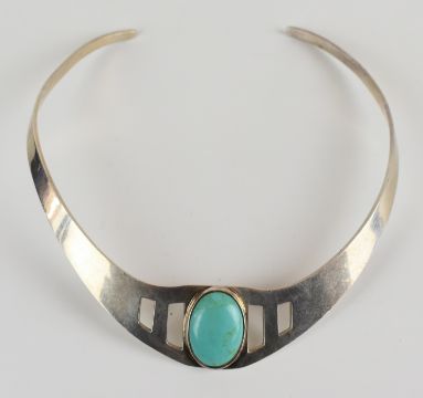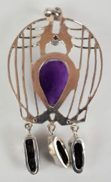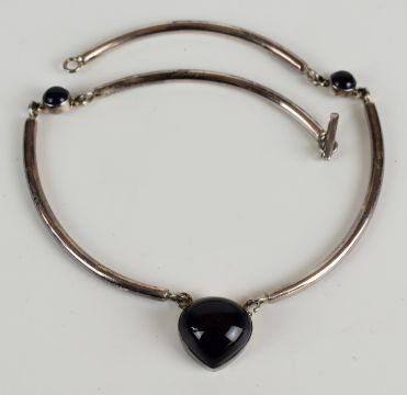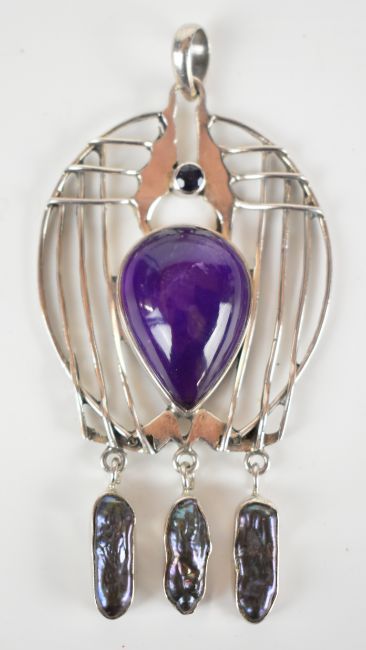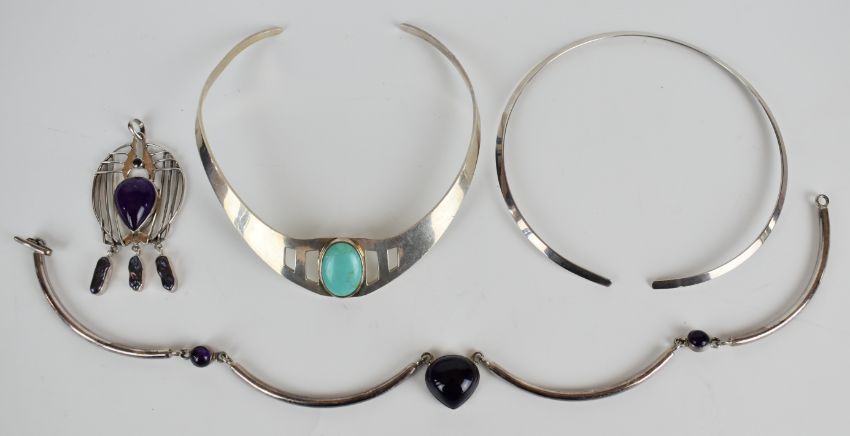 Three silver necklaces including turquoise, amethyst and amethyst and pearl, 135g