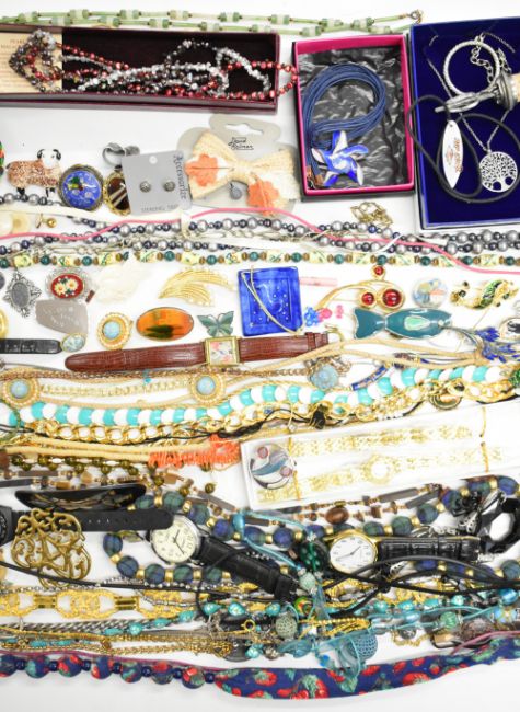 A collection of jewellery including Christian Dior earrings, necklaces including Napier, D'orlan and JewelCraft, brooches including vintage, agate brooch, serpent brooch, Rotary watch, Excalibre watch, beaded necklaces, vintage brooches, Stratton compacts, Art Deco silver plated cigarette cases, pearl necklace, etc, 200g