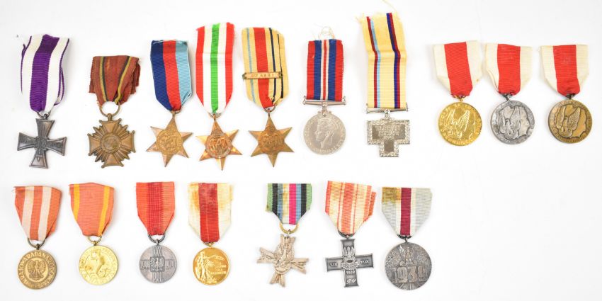 Polish WW2 and post WW2 medal group of seventeen comprising Cross of Valour, Cross of Merit 3rd Class, 1939-45 Star, Italy Star, Africa Star with 8th Army clasp, War Medal 1939-1945, commemorative Siege of Tobruk medal named to F. Wawrzusiszyn, Medal of Merit for National Defence of Poland 1st, 2nd and 3rd Class, Medal for Victory and Freedom 1945, Warsaw Medal 1939-45, 30 Years of the People's Poland, Merit in Firefighting / service, Cross of Combat Action of the Polish Armed Forces in the West, Cross of the September Campaign 1939 and Polish Participation In The Defence Of War In 1939