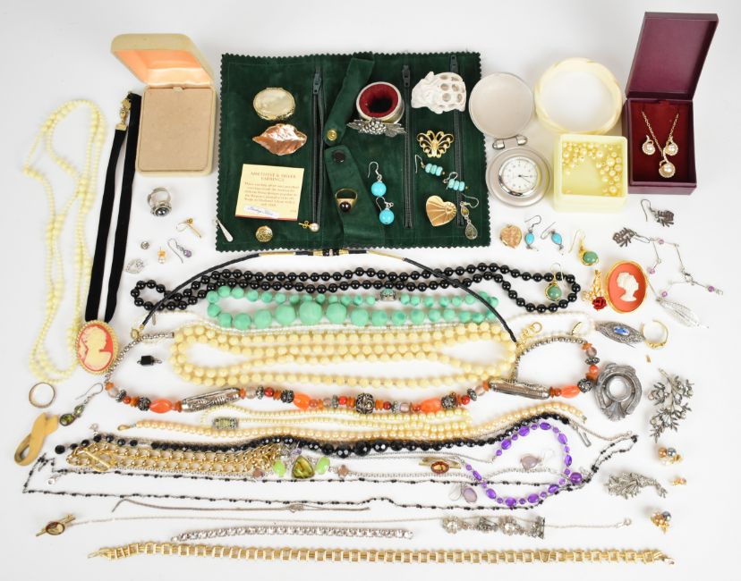A collection of jewellery including 18ct gold ring set with an opal (damaged, 3.2g), 9ct gold ring set with a synthetic ruby cabochon (4g, size N), two pairs of silver earrings, 9ct back and front locket, Anne Klein necklace, silver brooch, diamanté earrings and necklace, 9ct gold earrings (0.8g), etc