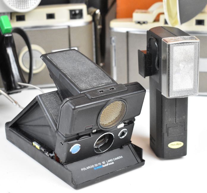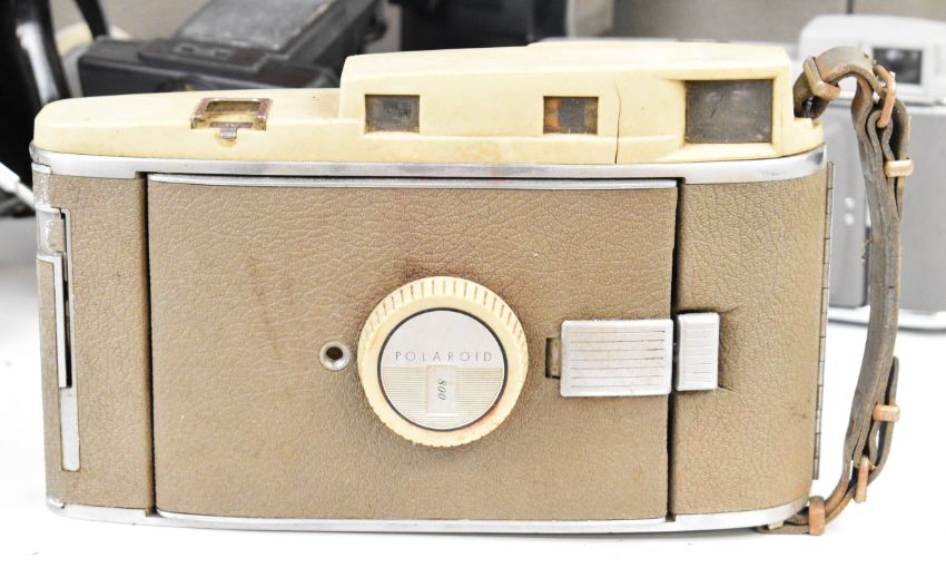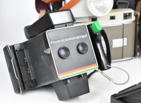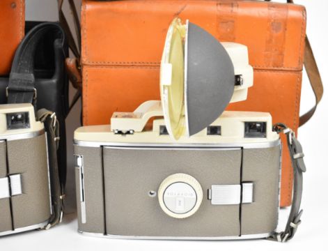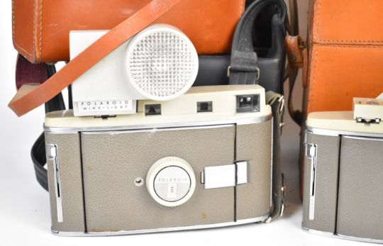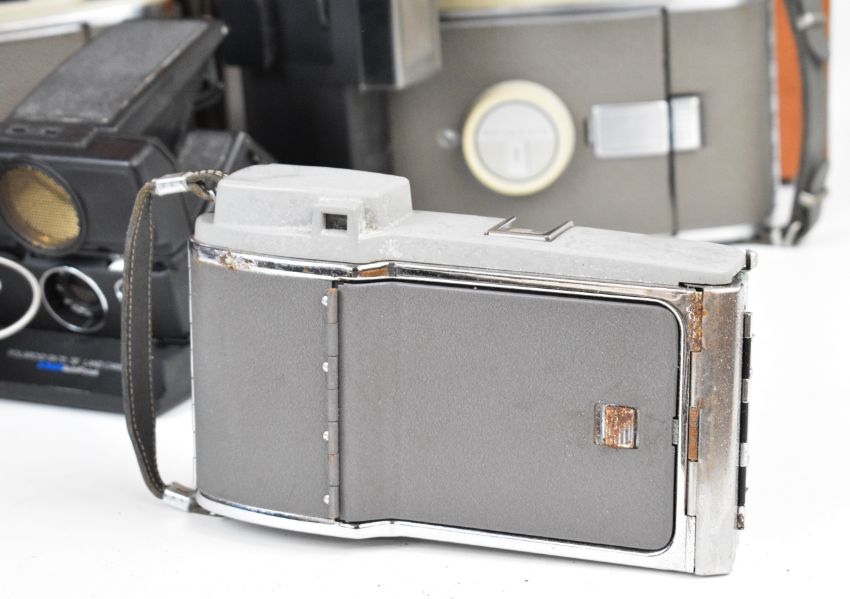 Six Polaroid cameras comprising three 800, one 80 an SX-70 SE Sonar autofocus and a Miniportrait, all but the Miniportrait in original cases