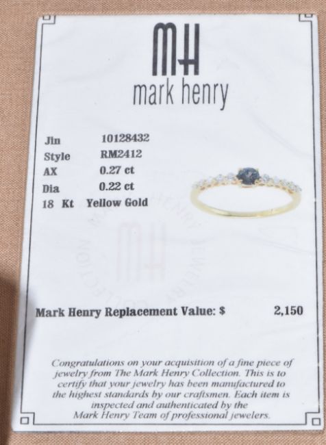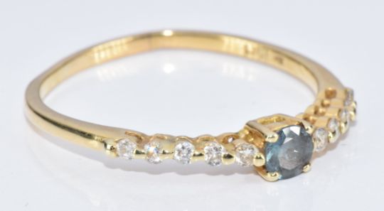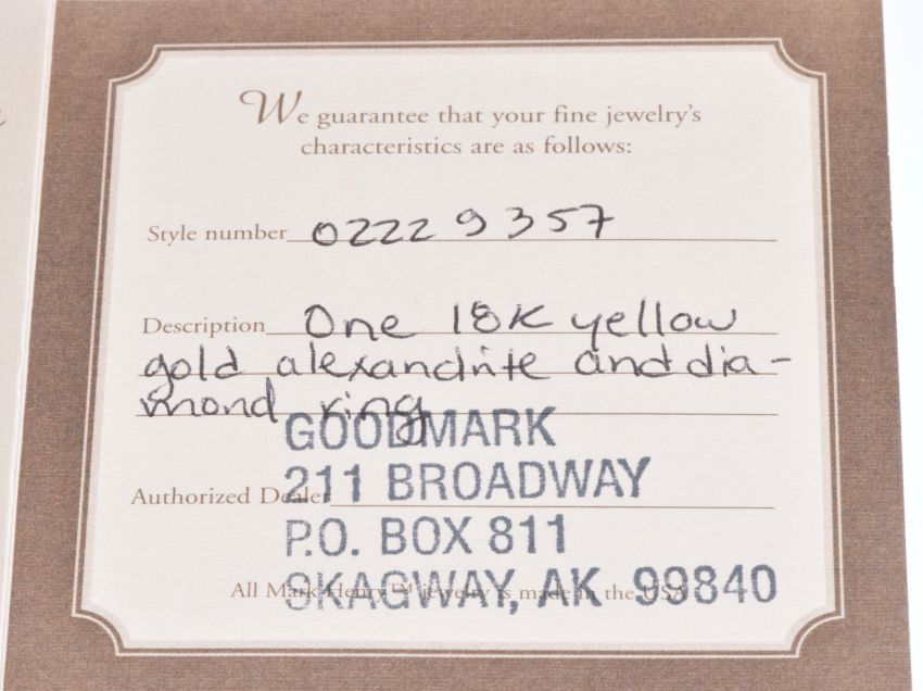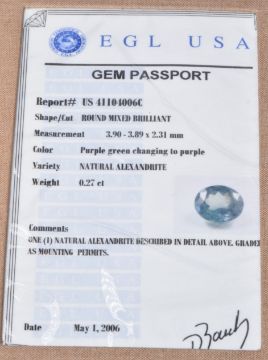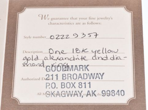 An 18k gold ring set with a round cut natural Alexandrite of approximately 0.27ct and diamonds, with certificate and replacement valuation, 2.1g, size U