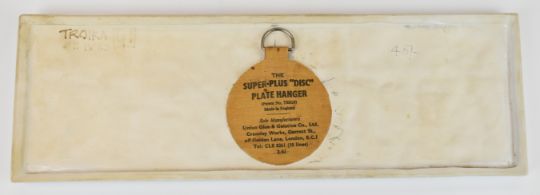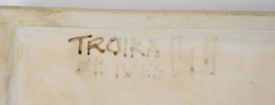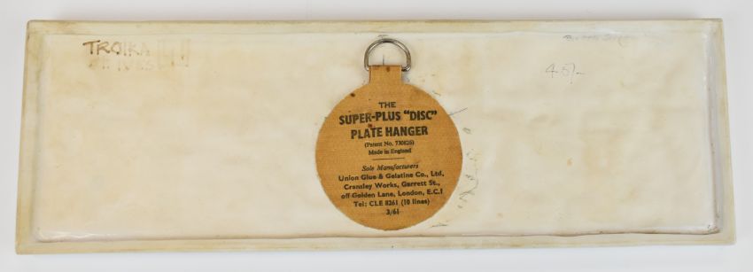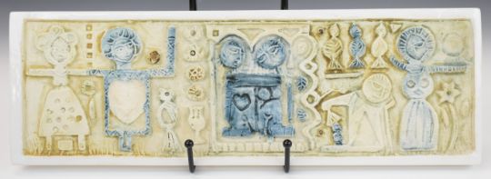 Troika relief moulded figural love plaque c1963-65, with marks verso including early trident mark, pencil signature for Benny Sirota, Troika St Ives and possibly the original price of forty five shillings, 12 x 36cm