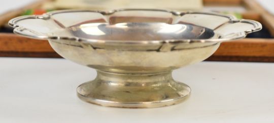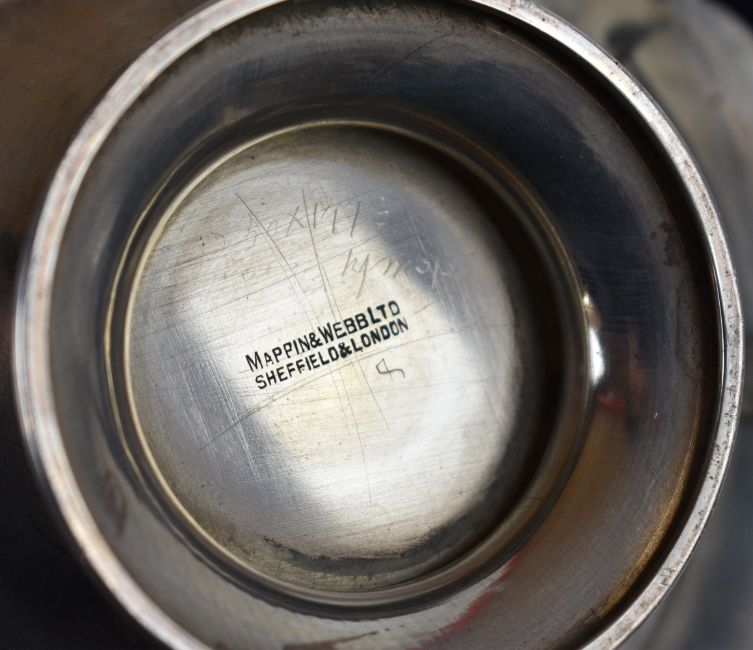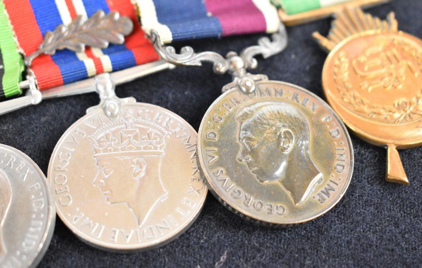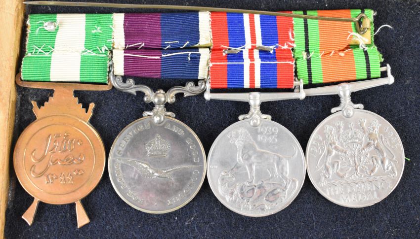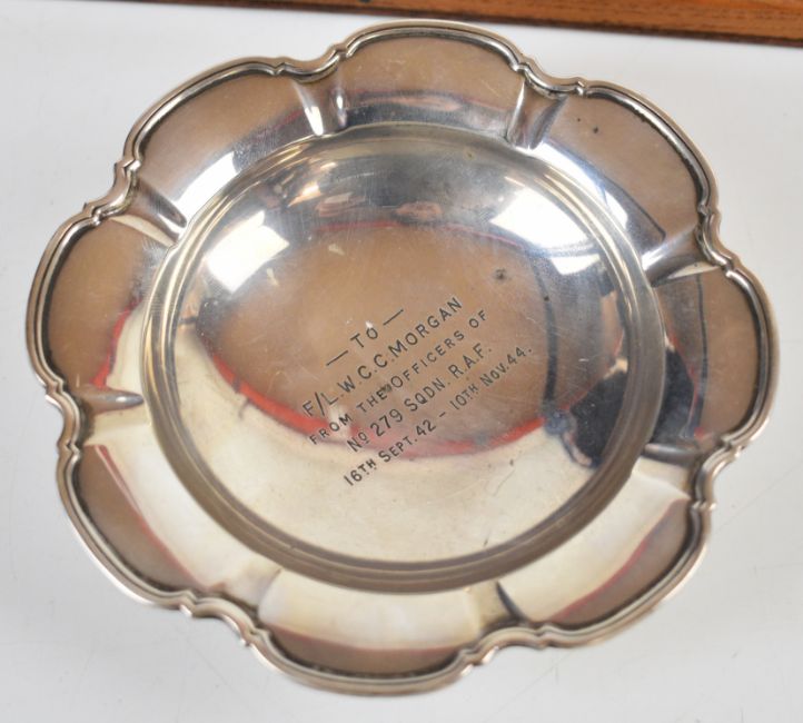 1920s to WW2 RAF medal group comprising Defence Medal, British War Medal with Mentioned in Dispatches oak leaf (Flight Lieutenant W.C.C. Morgan was Mentioned in Dispatches in the 1944 King's Birthday Honours), RAF Long Service and Good Conduct Medal named to 335768 ACT/SGT W.C.C. Morgan (Walter Cutler Case Morgan), RAF and an Iraq Active Service Medal with documentation including its certificate and information about the medal and it's approval by King George V, together with matching miniatures in wooden display box, overall size of display box 25.5cm x 17cm, with hallmarked silver Mappin & Webb bonbon dish engraved "To F/L.W.C.C. Morgan from the officers of No 279 SQDN. RAF, 16th Sept 42-10th Nov 44", diameter of dish 13cm