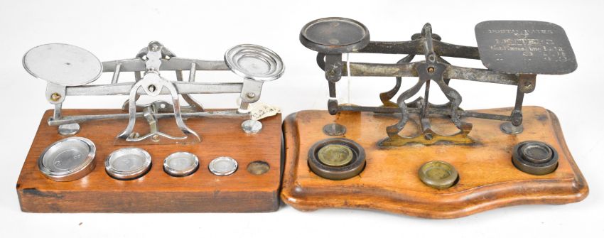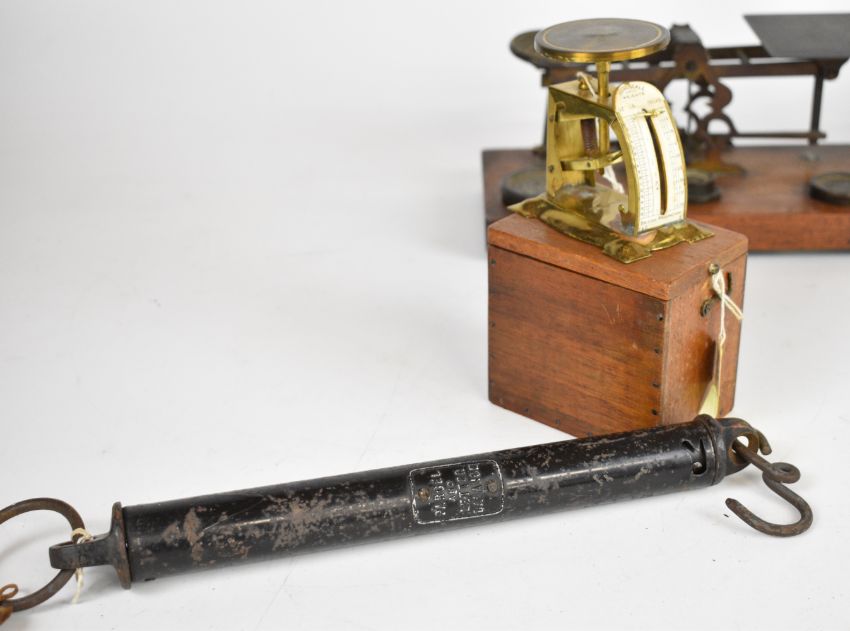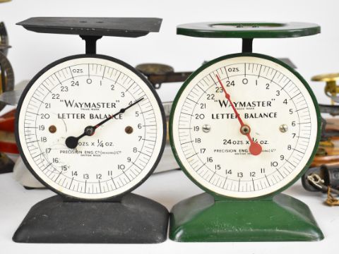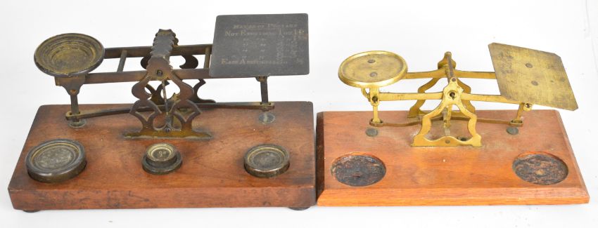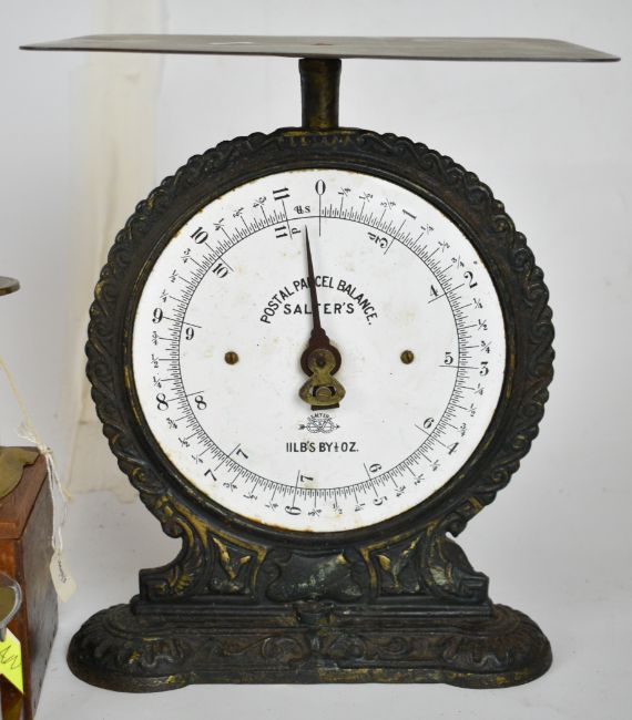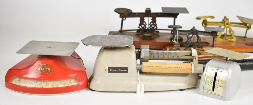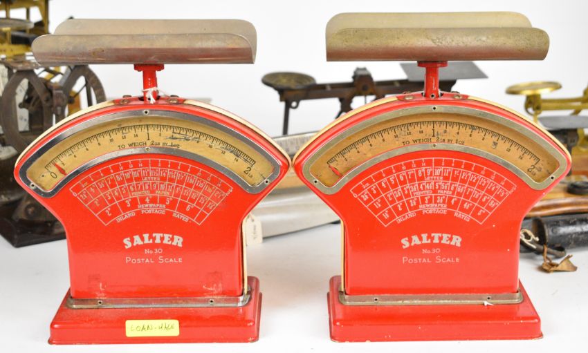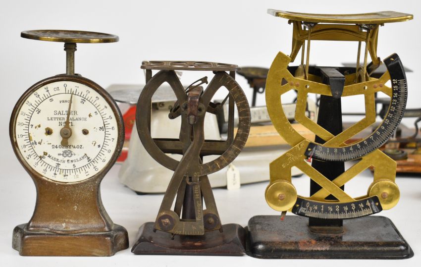 Seventeen Victorian and later letter, parcel and similar postage balances and scales to include many Salter examples, some with postage rates to pans, height of tallest 28cm