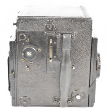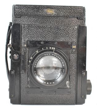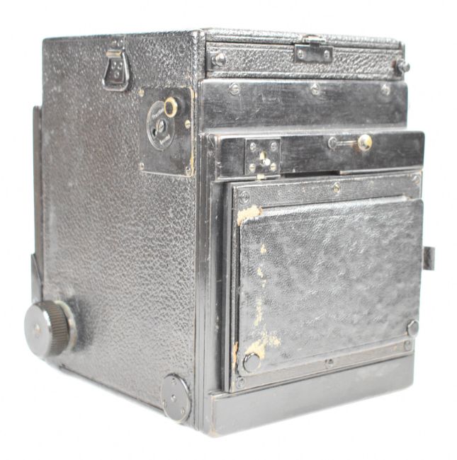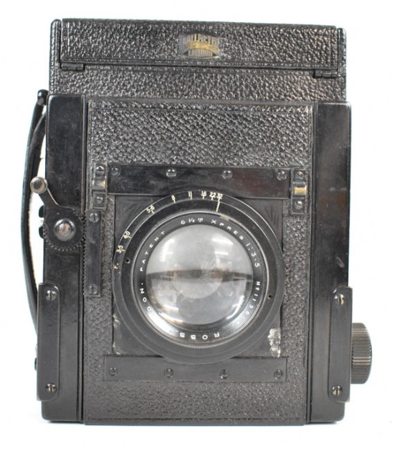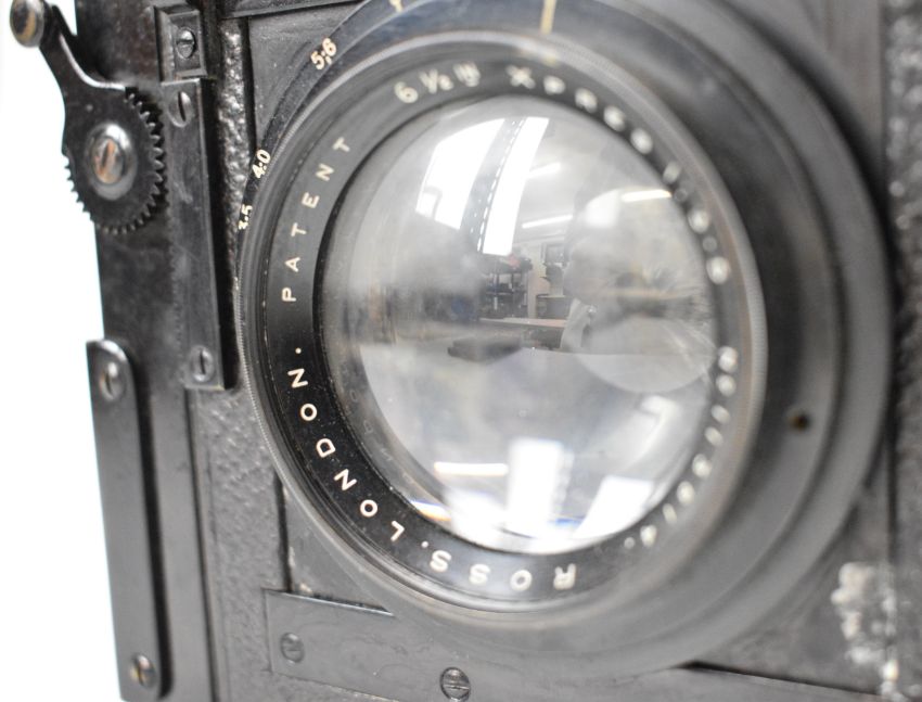 Dallmeyer large format camera with Kershaw patent to side and Ross Xpres 6 1/2 inch 1:3.5 lens, in leather case with four film holders