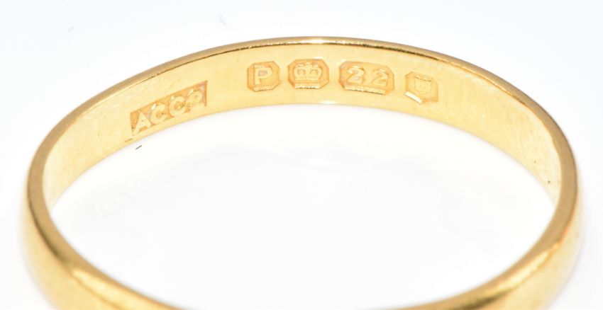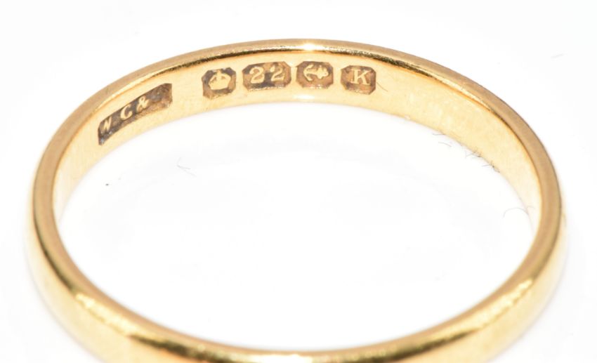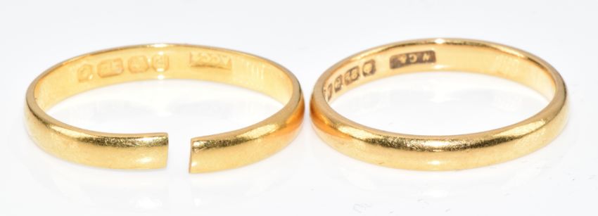 Two 22ct gold wedding bands (one band cut), 4.2g, size K