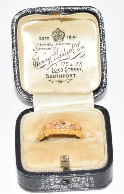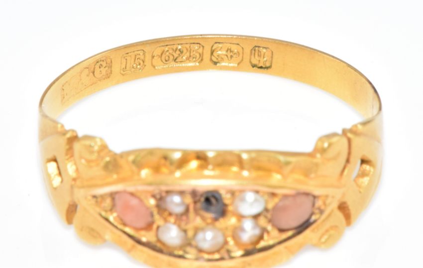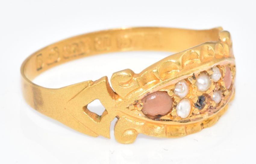 A 15ct gold ring set with coral and pearls (one pearl missing), 1.7g, size N, Birmingham 1890