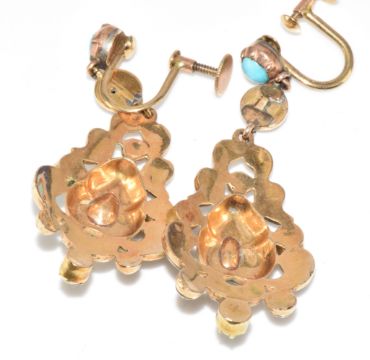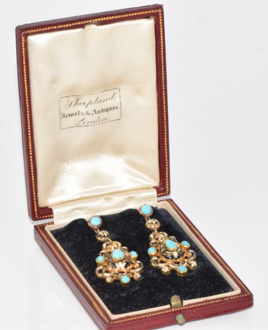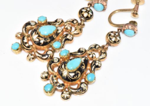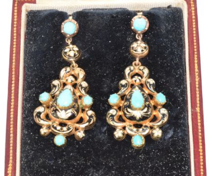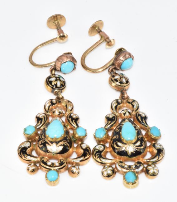 A pair of Victorian yellow metal earrings set with turquoise cabochons and black and white enamel, in original 'Shapland' antique box, 7.8g, 4.5cm