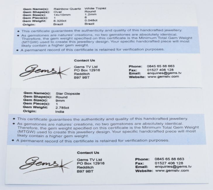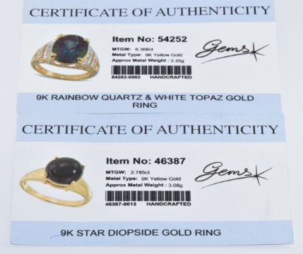 Two 9ct gold rings, one set with quartz and topaz and the other star diopside, with certificates, 8.8g, size N