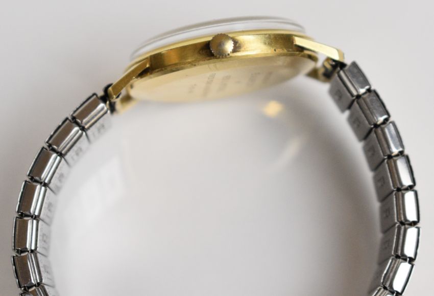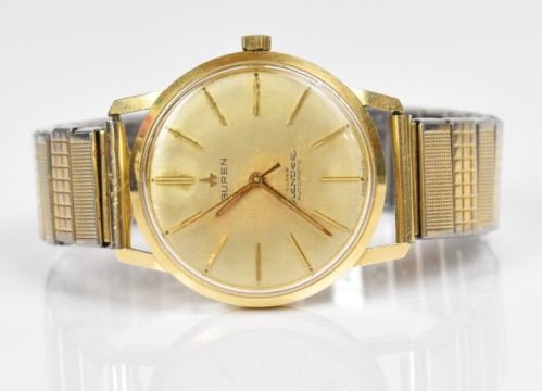 Buren Super Slender 14ct gold gentleman's automatic wristwatch with gold hands and baton hour markers, silver dial and signed Grand Prix 25 jewel movement, on expanding metal bracelet, case diameter 34mm, serial number 778601.