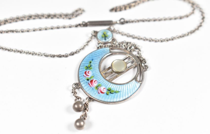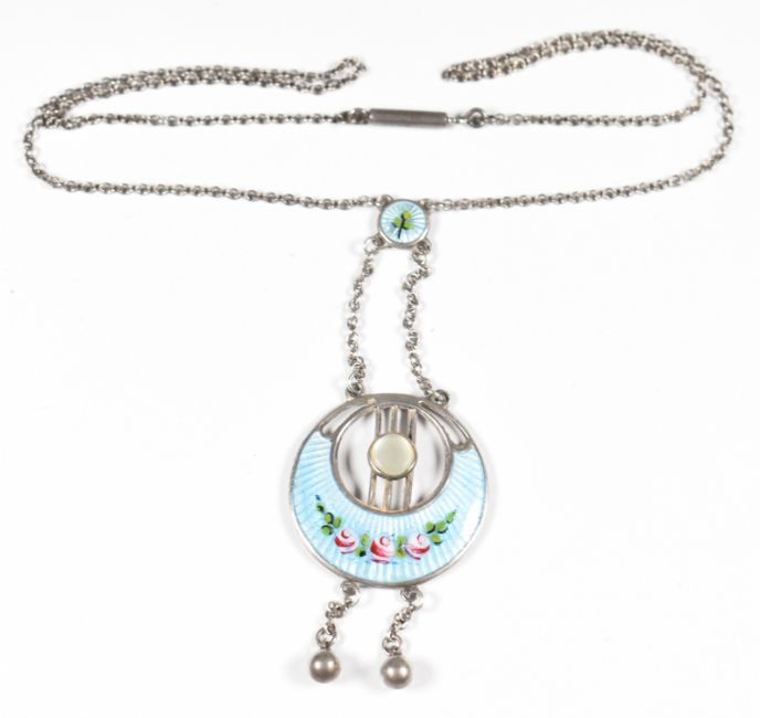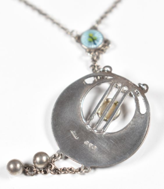 A hallmarked silver necklace set with enamel and mother of pearl, Chester 1915, 6.2g, 34cm