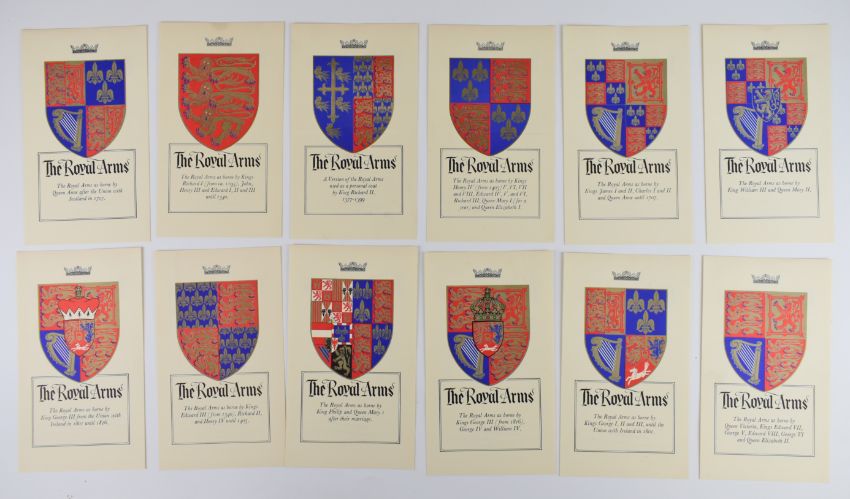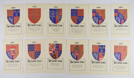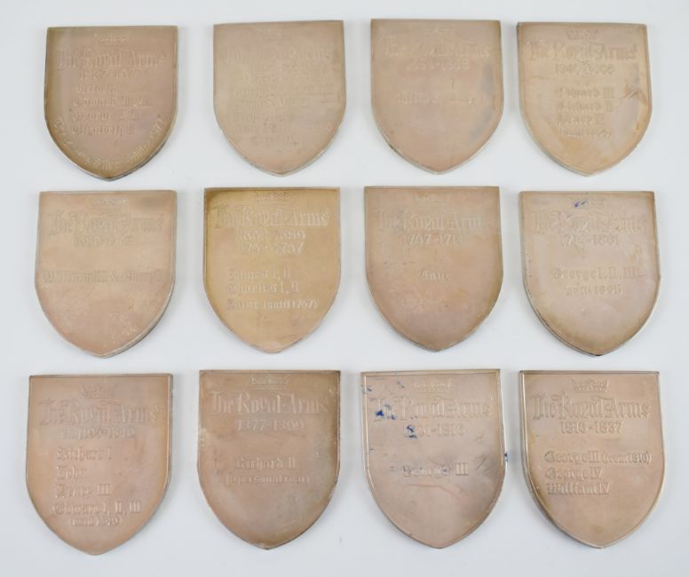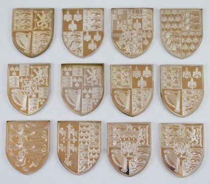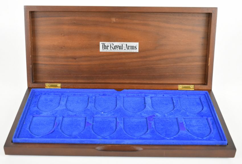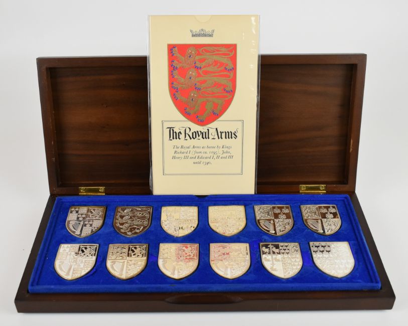 Yorkshire Mint cased set of 12 hallmarked silver commemorative Royal Arms shield shaped medallions, each Birmingham 1977, height of each shield 5cm, weight of all 12, 582g, with information sheets and contained in a fitted box