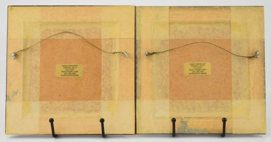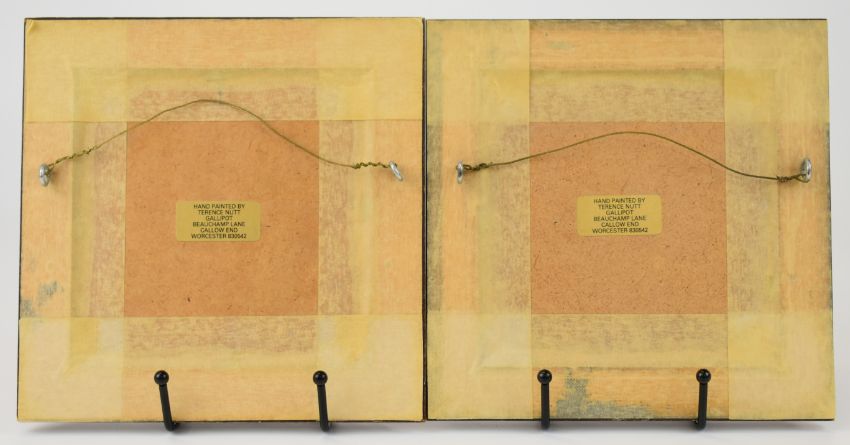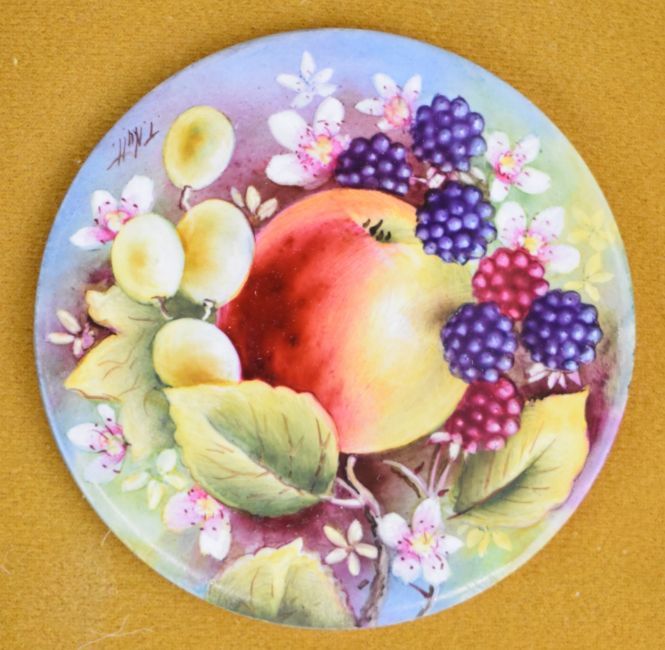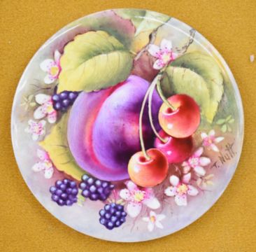 Two porcelain circular plaques decorated with painted fruit, signed by ex Royal Worcester artist T Nutt, diameter 9cm