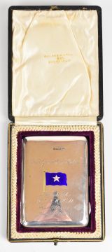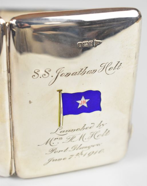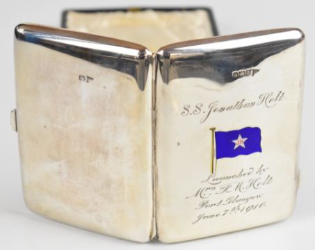 Walker & Hall John Holt shipping interest Edward VII hallmarked silver and enamel purse or case, to commemorate the launch of the SS Jonathan Holt by Mrs Holt at William Hamilton & Co, Port Glasgow, June 7th 1910, with enamel flag to front and fitted interior, Sheffield 1909, length 10.5cm, weight 141g all in, in original Walker & Hall fitted case