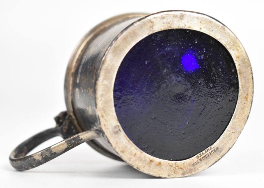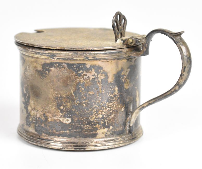 George V hallmarked silver mustard, London 1934, maker William Bruford & Son Ltd, length 8cm, weight excluding liner 62g