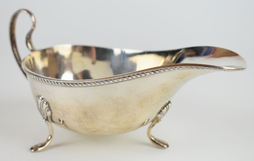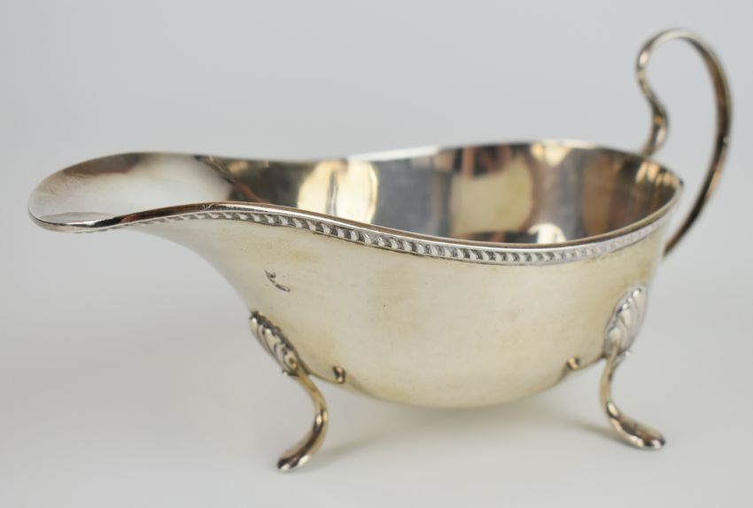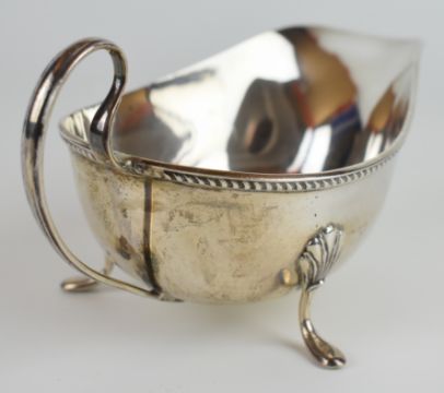 George V hallmarked silver sauce boat with gadrooned edge, loop handle and raised on three feet, Birmingham 1925, length 19cm, weight 166g