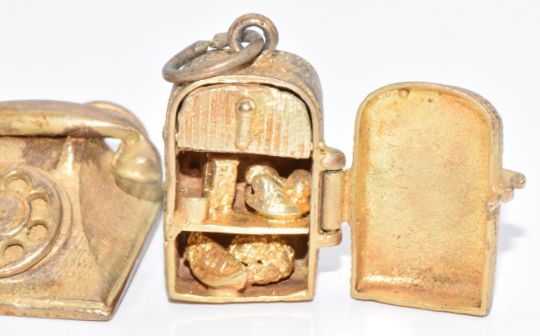 Four 9ct gold charms including a telephone, jug, train station with moving train and a fridge/ freezer opening to reveal food, 21.1g