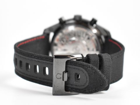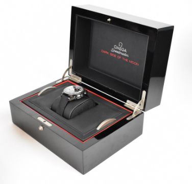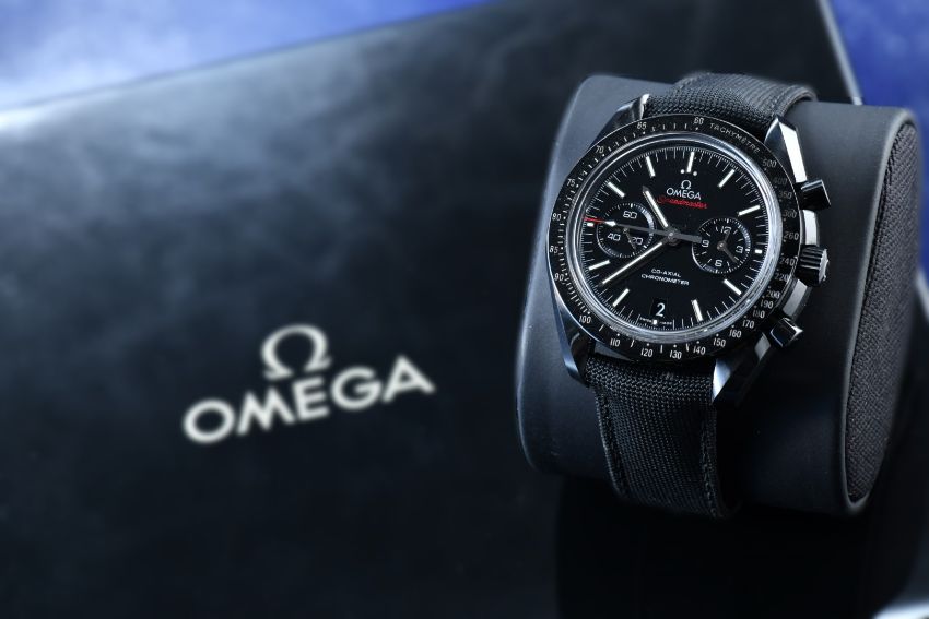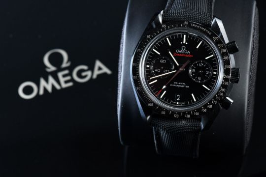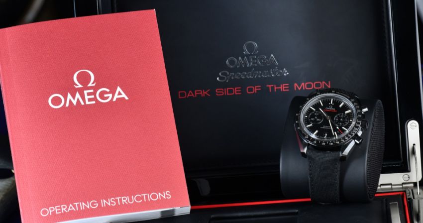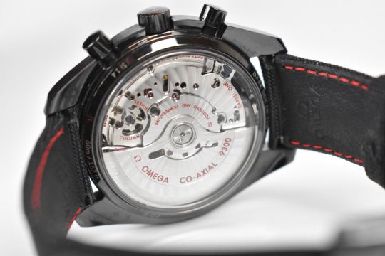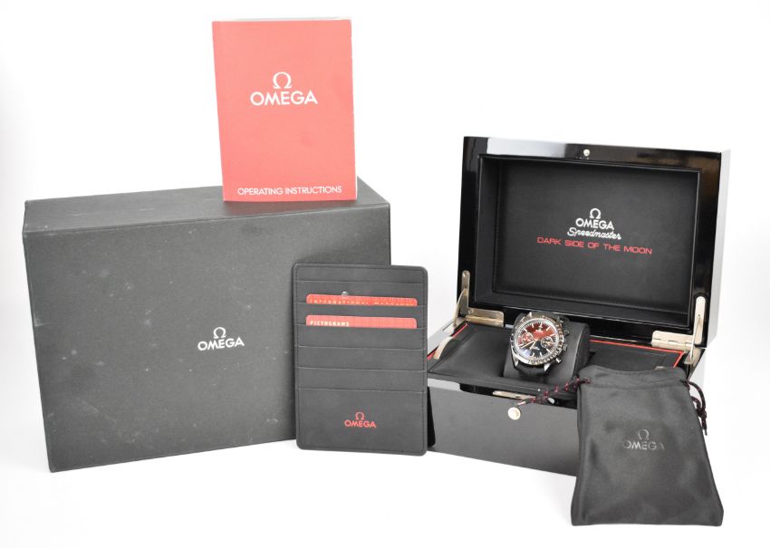 Omega Speedmaster Dark Side Of The Moon gentleman's chronograph wristwatch ref. 311.92.44.51.01.003 with date aperture, black ceramic tachymetre bezel, luminous 18ct gold hands and baton hour markers, black dial and case, clear exhibition case back and signed 54 jewel calibre 9300 Co-Axial Chronometer movement, on red stitched black canvas strap, case diameter 44mm, serial number 86728582, in original case with guarantee cards, related paperwork, hang tag, dust bag and outer box.