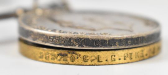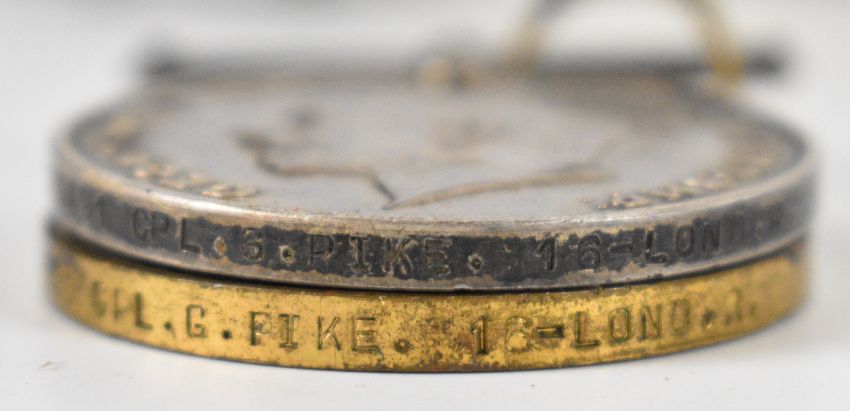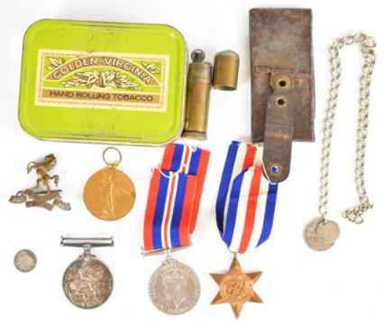 WW1 and WW2 medals comprising Victory Medal and British War Medal named to 553491 Cpl. G. Pike (George Pike), 16th London Regiment (16-Lond.R.), France and Germany Star and War Medal, together with Royal West Kent Regiment cap badge, trench art lighter, trench mirror, coins, medal card etc. PLEASE NOTE: DUE TO LIGHTER WE ARE NOT ABLE TO OFFER OUR USUAL POSTAGE SERVICE FOR THIS LOT