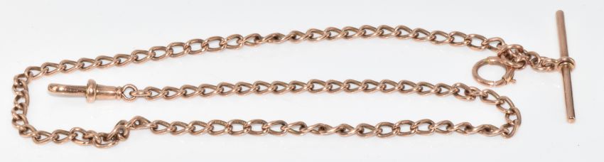 A 9ct gold watch chain with T-bar, dog clip and bolt clasp, 13.8g, 38cm