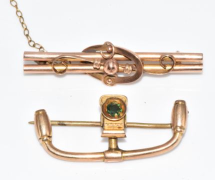Two 9ct gold bar brooches, one in the form of bicycle or motorcycle handlebars, 4.9g, 3.5 & 4cm