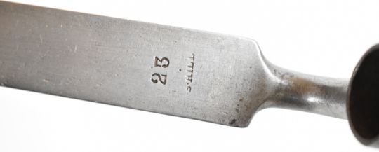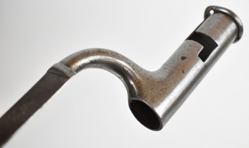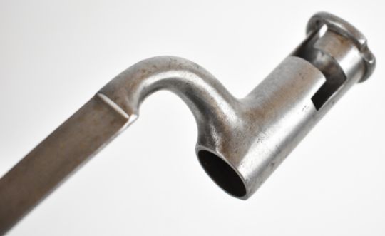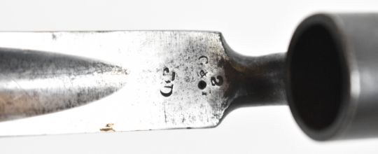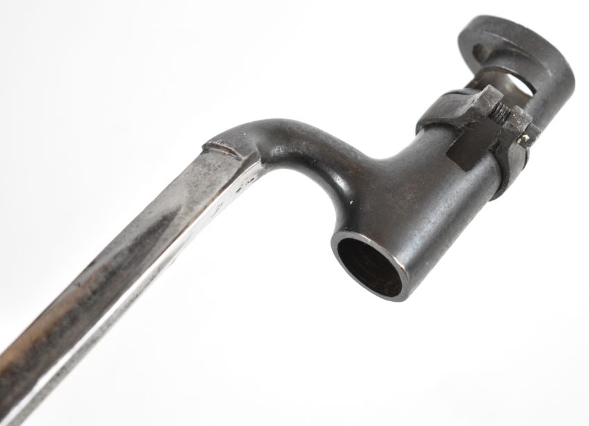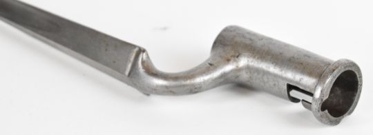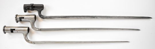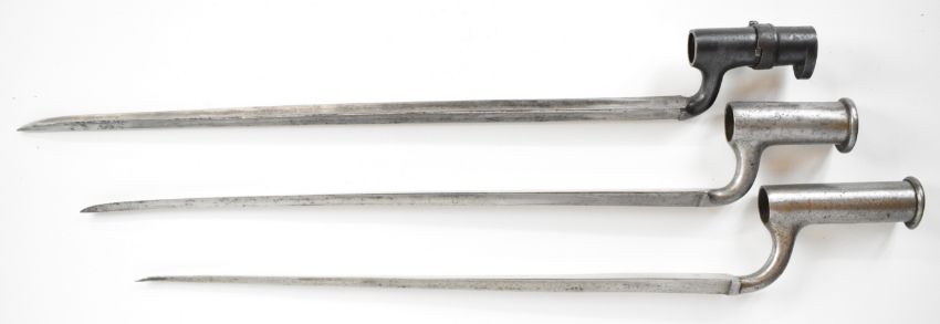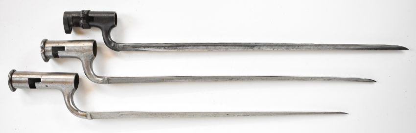 Three British bayonets comprising 1853 pattern socket bayonet, the 45cm triangular blade indistinctly stamped, together with two Brown Bess musket socket bayonets, triangular 42cm and 40cm blades, stamped S. Hill, 23 and Osborn & Gunby respectively. PLEASE NOTE: WE ARE NOT ABLE TO OFFER OUR USUAL POSTAGE SERVICE FOR THIS LOT