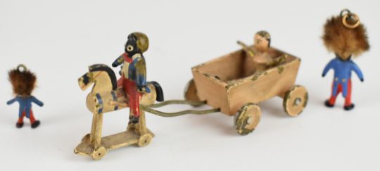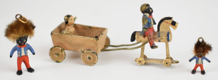Bronze or similar metal golly riding a toy horse towing a trolley, circular golly game with mirror verso and a similarly themed box Notice from the the-saleroom.com: These items are listed on the basis they are illustrative of a bygone culture in which there were different social norms. We understand the potential controversy surrounding this type of item but believe that providing transparent information about historical context fosters greater understanding of our complex cultural history.