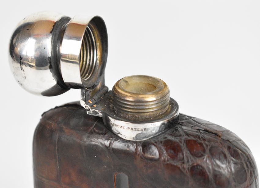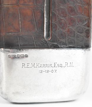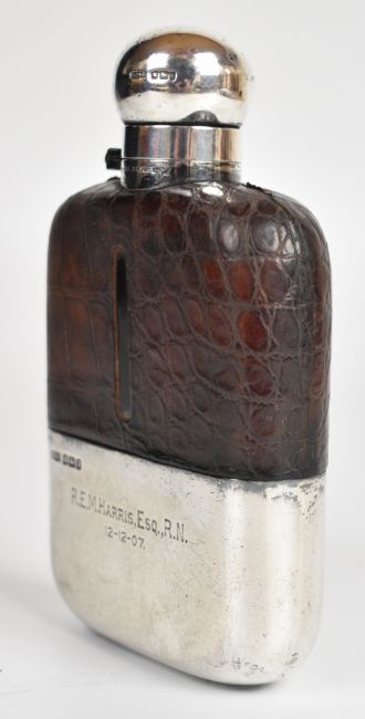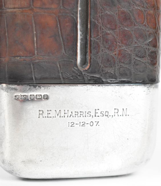 Edward VII hallmarked silver and glass hip flask with captive screw cap and pull off cup, engraved R.E.M.Harris Esq Royal Navy, Sheffield 1907 maker James Dixon & Sons Ltd, overall height 14cm, weight of cup 87g