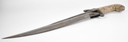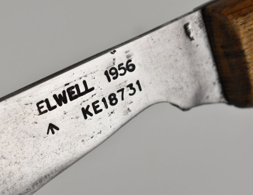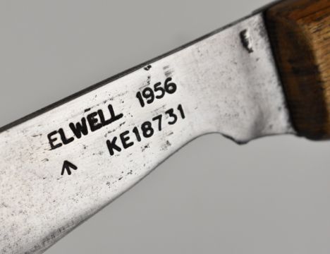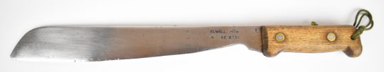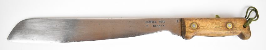 Two machete type blades comprising a Elwell 1956 KE18731 machete with 33cm blade and maker's mark and military broad arrow to ricasso, in canvas scabbard with script, together with another 28.5cm blade with wooden handle. PLEASE NOTE: WE ARE NOT ABLE TO OFFER OUR USUAL POSTAGE SERVICE FOR THIS LOT