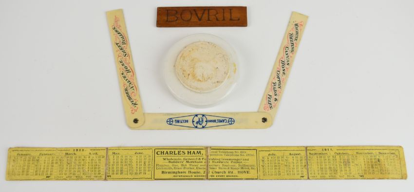 Advertising pin dish and rulers comprising pictorial 19thC Charles patent pyramid night light, Bovril, F Reddaway, Manchester and London Camel Brand belting and a Charles Ham Wholesale Ironmongers of Hove fold out ruler / calendar for 1911