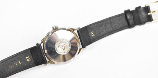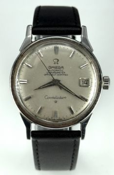 Omega Constellation gentleman's automatic chronometer wristwatch ref. 168.005 with date aperture silver hands, hour markers and dial, stainless steel case and signed 24 jewel calibre 561 movement, on black leather strap, case diameter 34mm, serial number 24500899.