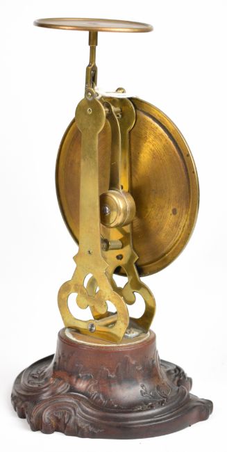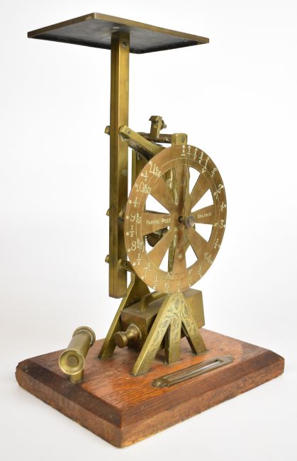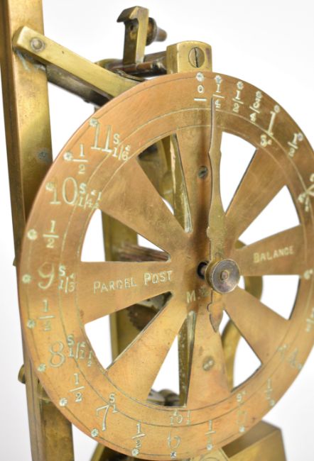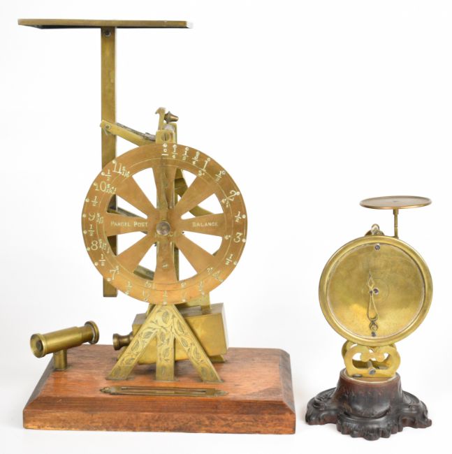 19th century swinging weight parcel post balance or scales with prices to dial and maker's mark M & Co., height 34.5cm, together with a similar smaller swinging weight letter balance