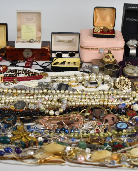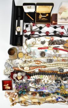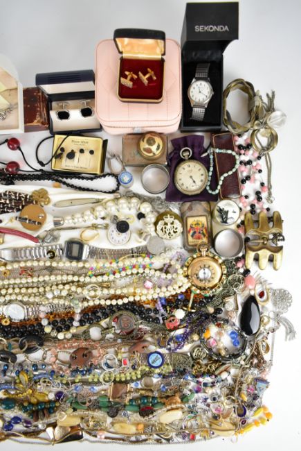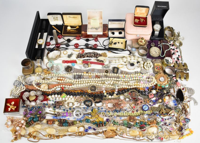 A collection of jewellery including eighteen pairs of silver earrings, beaded necklaces, watches, silver and aventurine quartz necklace, silver including chain and pendant, Greek key bracelet, rings and a  locket, Art Deco dragonfly brooch, two single 9ct gold earrings (1.4g), a gold plated pocket watch, etc