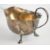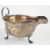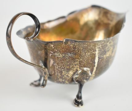 Mappin & Webb George V hallmarked silver sauce boat with wavy edge and scroll handles, raised on three feet, Sheffield 1931, length 15cm, weight 94g