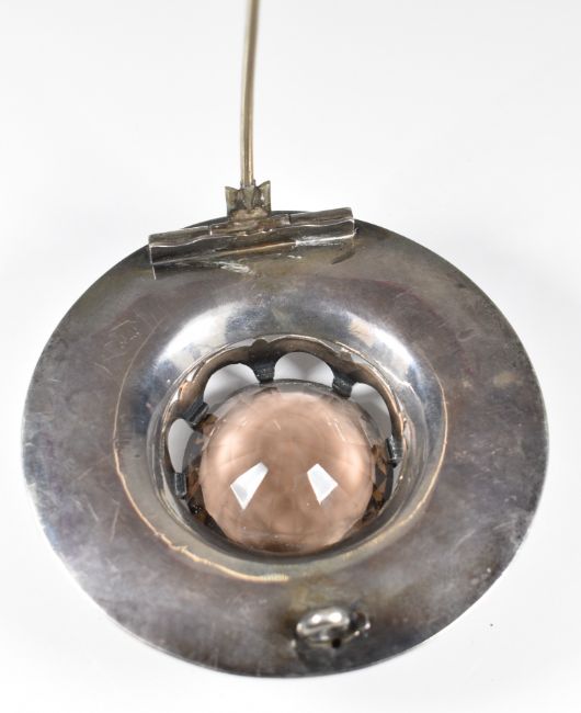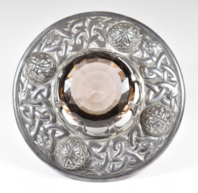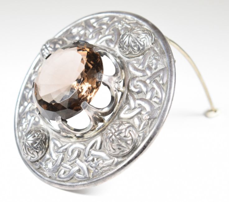 Victorian silver kilt pin / brooch set with a large smoky quartz 4cm in diameter and with embossed Celtic design, 232g, 10.2cm