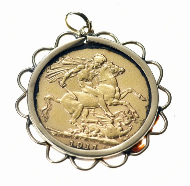 1911 gold full sovereign in 9ct gold mount, 9.4g