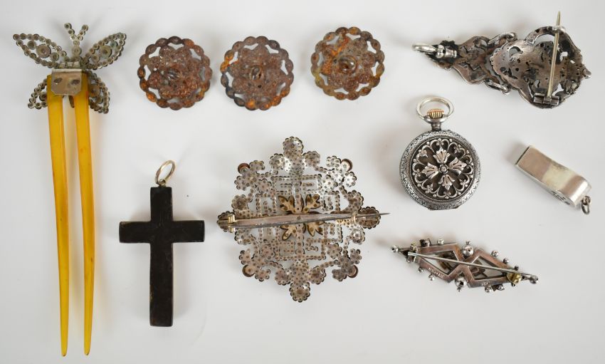 A collection of jewellery including Victorian cut steel hair slide, brooch and three buttons, Victorian silver brooch, tortoiseshell cross with inlaid gold decoration, faceted pendant loop, Swiss silver whistle and silver fob watch by Leroy & Fils with brooch fitting