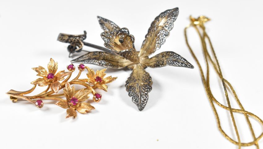 A 9ct gold brooch in the form of flowers set with rubies (5.8g, 4.5cm), Victorian stick pin set with coral (damaged), two white metal filigree brooches and paste set swallow brooch, etc