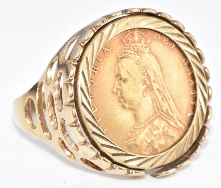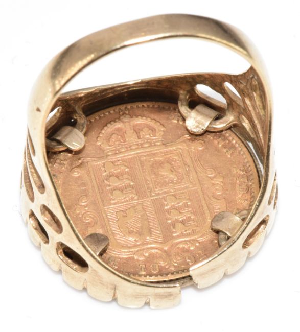 A 9ct gold ring set with an 1892 gold half sovereign, 7.8g, size S